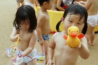 夏だ!かき氷だ!水遊びだ!という事で園庭にある大きなビニールプールに溜めてある水が太陽の光を反射してキラキラ光っていました。5月に行われた保育参観でお家の人と作ったジョーロを使って水遊びTime!「冷た〜い」「気持ちいい」の言葉が園庭の至る所で聞こえてきました。水が入ったジョーロを見つめている子に「どうしたの?」と聞いてみるとペットボトルのケースが中に入っている水と光の屈折でキラキラ輝く様子をじっと見つめていました。世界に1つだけのジョーロ、、大切にしてね。