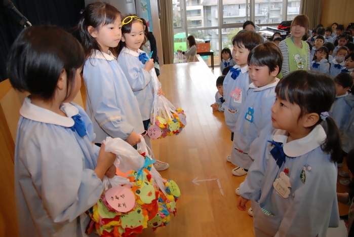 年中児から年長児に、小学校に行っても頑張って下さいの気持ちを込めた時間割のプレゼントを送りました。大切に使って下さいね。