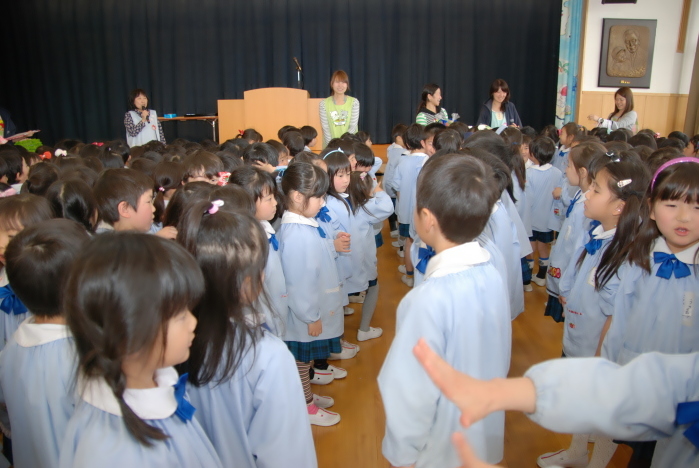 式にはもう一つ、幼稚園を旅たつ年長児と3人の先生とのお別れも・・・